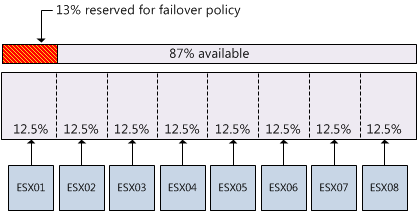 vSphere introduced the HA admission control policy “Percentage of Cluster Resources Reserved”. This policy allows the user to specify a percentage of the total amount of available resources that will stay reserved to accommodate host failures. When using vSphere 4.1 this policy is the de facto recommended admission control policy as it avoids the conservative slots calculation method. Reserved failover capacity The HA Deepdive page explains in detail how the “percentage resources reserved” policy works, but to summarize; the CPU or memory capacity of the cluster is calculated as followed;The available capacity is the sum of all ESX hosts inside the cluster minus the virtualization overhead, multiplied by (1-percentage value). For instance; a cluster exists out of 8 ESX hosts, each containing 70GB of available RAM. The percentage of cluster resources reserved is set to 20%. This leads to a cluster memory capacity of 448GB (70GB+70GB+70GB+70GB+70GB+70GB+70GB+70GB) * (1 – 20%). 112GB is reserved as failover capacity. Although the example zooms in on memory, the percentage set applies both CPU and memory resources. Once a percentage is specified, that percentage of resources will be unavailable for active virtual machines, therefore it makes sense to set the percentage as low as possible. There are multiple approaches for defining a percentage suitable for your needs. One approach, the host-level-approach is to use a percentage that corresponds with the contribution of one or host or a multiplier of that. Another approach is the aggressive approach which sets a percentage that equals less than the contribution of one host. Which approach should be used? Host-level In the previous example 20% was used to be reserved for resources in an 8-host cluster. This configuration reserves more resources than a single host contributes to the cluster. High Availability’s main objective is to provide automatic recovery for virtual machines after a physical server failure. For this reason, it is recommended to reserve resource equal to a single host or a multiplier of that. When using the per-host level of granularity in an 8-host cluster (homogeneous configured hosts), the resource contribution per host to the cluster is 12.5%. However, the percentage used must be an integer (whole number). Using a conservative approach it is better to round up to guarantee that the full capacity of one host is protected, in this example, the conservative approach would lead to a percentage of 13%.