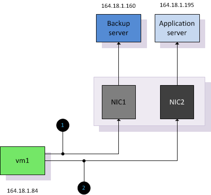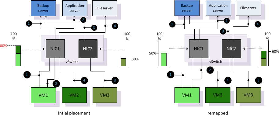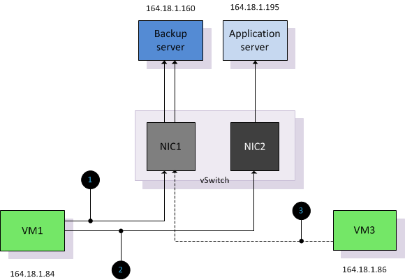 The vSwitch is configured with two uplinks. Connection 1: VM1 > Backup Server (A4120154 Xor A41201A0 = F4) % 2 = 0 Connection 2: VM1 > Application Server (A4120154 Xor A41201C3 = 97) % 2 = 1
