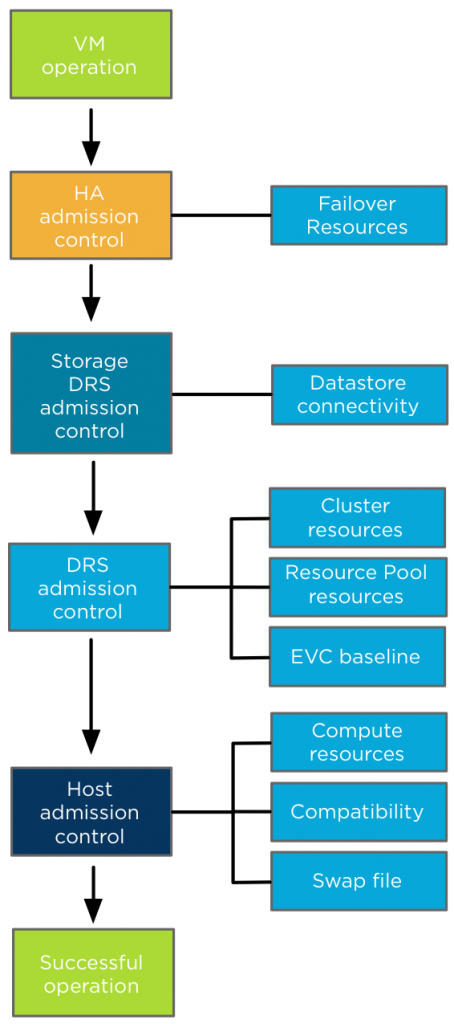 High Availability Admission control: During a virtual machine power-on operation, HA checks if the virtual machine can be powered-on without violating the required capacity to cope with a host failure event. Depending on the HA admission control policy, HA checks if the cluster can provide enough unreserved resources to satisfy the virtual machine reservation. The internals of each type Admission control policies is outside the scope of this article, more information can be found in the clustering deep dive books or online at Yellow-bricks. After HA admission control gives the green light, it’s up to Storage DRS admission control if the virtual machine is placed in a Storage DRS datastore cluster. Storage DRS admission control checks datastore connectivity amongst the hosts in the datastore cluster and selects the hosts with the highest datastore connectivity to ensure the highest portability of a virtual machine. If there are multiple hosts with the same number of datastore connected it selects the host with the lowest compute utilization. Up next is DRS admission control to review the cluster state. DRS ensures that sufficient unreserved resources are available in the cluster before allowing the virtual machine to power on. If the virtual machine is placed inside a resource pool, DRS checks if the resource pool can provide enough resources to satisfy the reservation. Depending on the setting “expandable reservation” the resource pool checks its own pool of unreserved resources or borrows resources from its parent. If a virtual machine is moved into the cluster and EVC is enabled in the DRS cluster, EVC admission control verifies if the applied EVC mode to the virtual machine does not exceed the current EVC baseline of the cluster. DRS selects a host based on configured VM-VM and VM-Host affinity rules. Last step is Host admission control. In the end it’s the host that actually needs to provide the compute environment to allow the virtual machine to operate in. A cluster can have enough unreserved resources available, but it can be in a fragmented stage, where there are not enough resources available per host to satisfy the virtual machine reservation. To solve this problem a DRS invocation is triggered to recommend virtual machine migrations to re-balance the cluster and free up space on a particular host for the new virtual machine. If DRS is not enabled, the Host rejects the virtual machine due to the inability to provide the required resources. Host admission control also verifies is the virtual machine configuration is compatible with the host. The VM networks and datastores must be available in order to accommodate the virtual machine. The virtual machine compatibility list also the suitable host if the virtual machine is placed inside a “must” VM-Host affinity rules, admission control checks if its listed in the compatibility list. The last check is if the host can create a VM-swap file on the designated VM swap location. So there you have it before a virtual machine is powered-on or moved into a cluster, all these admission controls will make sure the virtual machine can operate within its required parameters and no cluster feature requirement is being violated.