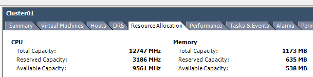 As the DRS cluster reserves this memory per host, all the memory aggregated inside the root resource pool and is actually designated as reserved memory. However to prevent confusion, this reserved memory is labeled as unused reserved memory in the vSphere Client user interface and as such provided to the child resource pools and child virtual machines.At the Resource Allocation Tab of the cluster, the Total memory capacity of the cluster is listed as well as the reserved capacity. The Available capacity is the result of Total capacity – Reserved capacity. Note that if HA is configured the amount of resources reserved for failover is automatically added to the reserved capacity.