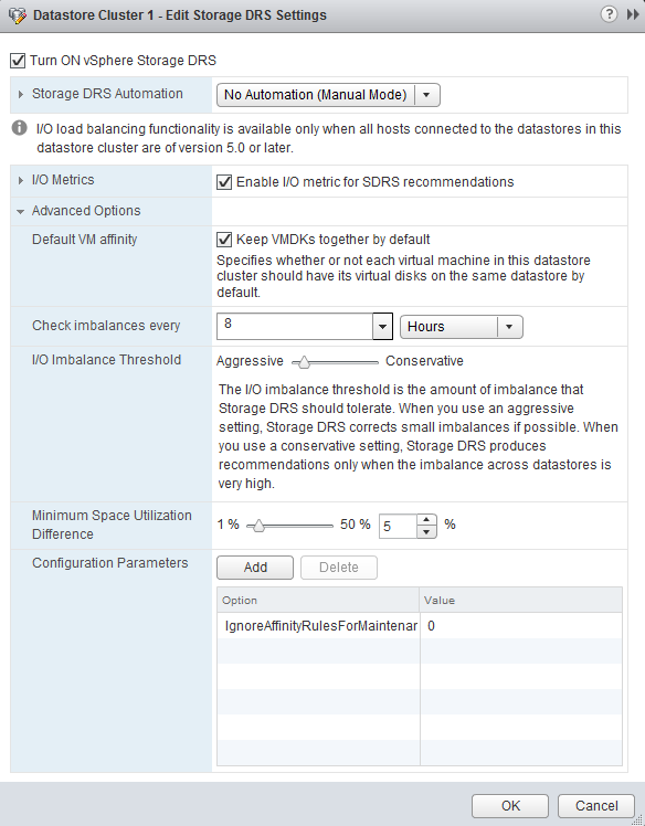 In vSphere 5.1 you can configure the default (anti) affinity rule of the datastore cluster via the user interface. Please note that this feature is only available via the web client. The vSphere client does not contain this option. By default the Storage DRS applies an intra-VM vmdk affinity rule, forcing Storage DRS to place all the files and vmdk files of a virtual machine on a single datastore. By deselecting the option “Keep VMDKs together by default” the opposite becomes true and an Intra-VM anti-affinity rule is applied. This forces Storage DRS to place the VM files and each VDMK file on a separate datastore.