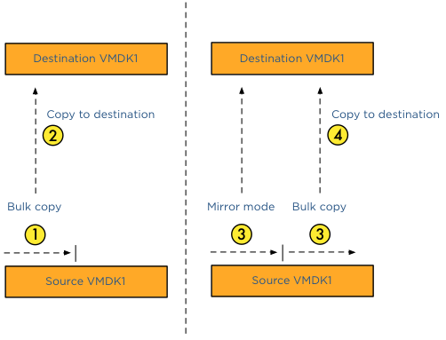 Does the new vMotion support multi-NIC for disk migration? The disk data is picked up by the vMotion code, this means vMotion transparently load balances the disk data traffic over all available vMotion vmknics. vSphere 5.1 vMotion leverages all the enhancements introduced in the vSphere 5.0 such as Multi-NIC support and SDPS. Duncan wrote a nice article on these two features. Is there any limitation to the new vMotion when the virtual machine is using shared vs. unshared swap ? No, either will work, just as with the traditional vMotion. Will the new vMotion features be leveraged by DRS/DPM/Storage DRS ? In vSphere 5.1 DRS, DPM and Storage DRS will not issue a vMotion that copies data between datastores. DRS and DPM remains to leverage traditional vMotion, while Storage DRS issues storage vMotions to move data between datastores in the datastore cluster. Maintenance mode, a part of the DRS stack, will not issue a data moving vMotion operation. Data moving vMotion operations are more expensive than traditional vMotion and the cost/risk benefit must be taken into account when making migration decisions. A major overhaul of the DRS algorithm code is necessary to include this into the framework, and this was not feasible during this release. How many concurrent vMotion operations that copies data between datastores can I run simultaneously? A vMotion that copies data between datastores will count against the limitations of concurrent vMotion and Storage vMotion of a host. In vSphere 5.1 one cannot perform more than 2 concurrent Storage vMotions per host. As a result no more than 2 concurrent vMotions that copy data will be allowed. For more information about the costs of the vMotion process, I recommend to read the article: “Limiting the number of Storage vMotions” How is disk data migration via vMotion different from a Storage vMotion? The main difference between vMotion and Storage vMotion is that vMotion does not “touch” the storage subsystem for copy operations of non-shared datastores, but transfers the disk data via an Ethernet network. Due to the possibilities of longer distances and higher latency, disk data is transferred asynchronously. To cope with higher latencies, a lot of changes were made to the buffer structure of the vMotion process. However if vMotion detects that the Guest OS issues I/O faster than the network transfer rate, or that the destination datastore is not keeping up with the incoming changes, vMotion can switch to synchronous mirror mode to ensure the correctness of data. I understand that the vMotion module transmits the disk data to the destination, but how are changed blocks during migration time handled? For disk data migration vMotion uses the same architecture as Storage vMotion to handle disk content. There are two major components in play – bulk copy and the mirror mode driver. vMotion kicks off a bulk copy and copies as much as content possible to the destination datastore via the vMotion network. During this bulk copy, blocks can be changed, some blocks are not yet copied, but some of them can already reside on the destination datastore. If the Guest OS changes blocks that are already copied by the bulk copy process, the mirror mode drive will write them to the source and destination datastore, keeping them both in lock-step. The mirror mode driver ignores all the blocks that are changed but not yet copied, as the ongoing bulk copy will pick them up. To keep the IO performance as high as possible, a buffer is available for the mirror mode driver. If high latencies are detected on the vMotion network, the mirror mode driver can write the changes to the buffer instead of delaying the I/O writes to both source and destination disk. If you want to know more about the mirror mode driver, Yellow bricks contains a out-take of our book about the mirror mode driver.