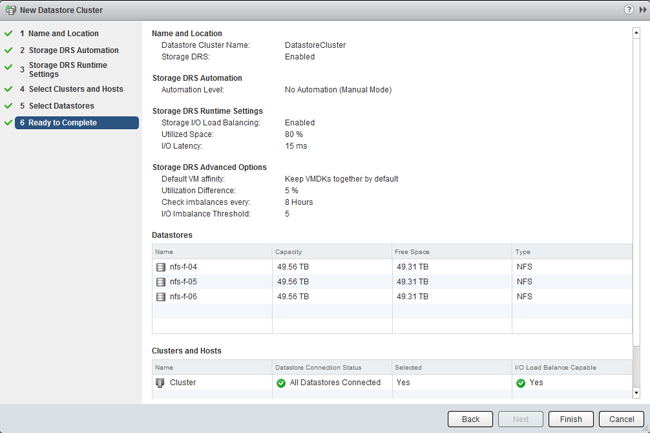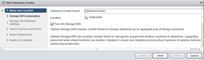 3. Name and Location The first steps are to enable Storage DRS, specify the datastore cluster name and check if the “Turn on Storage DRS” option is enabled.