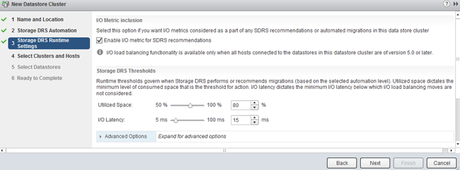 No Automation (Manual Mode) Manual mode is the default mode of operation. When the datastore cluster is operating in manual mode, placement and migration recommendations are presented to the user, but are not executed until they are manually approved. Fully Automated Fully automated allows Storage DRS to apply space and I/O load-balance migration recommendations automatically. No user intervention is required. However, initial placement recommendations still require user approval. Storage DRS allows virtual machines to have individual automation level settings that override datastore cluster-level automation level settings. Similar to when DRS was introduced, I recommend to start using manual mode first and review the generated recommendations. If you are comfortable with the decision matrix of Storage DRS you can switch to fully automated. Please note that you can switch between modes on the fly and without incurring downtime. 5. Storage DRS Runtime Settings
