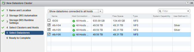 7. Select Datastores By default, only datastores connected to all hosts in the selected (DRS) cluster(s) are shown. The Show datastore dropdown menu provides the options to show partially connected datastores. The article partially connected datastore cluster gives you insight of the impact of this design decision.