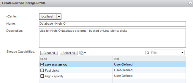 Virtual Machine Storage Profiles are used to identify the storage capabilities necessary in order to properly run the application within the virtual machine. VM Storage Profiles need to enabled first on the hosts and/or Cluster before you are able to assign them to a virtual machine. 1. Select VM Storage Profiles in the Home screen