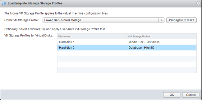 Please note that you can assign different storage profiles to the virtual machine working directory and each single VMDK. The working directory is where the .vmx, .nvram, .log resides. This is listed in the UI as the Home VM location. Each VMDK can be assigned with a different storage profile to align it with your SLA’s.