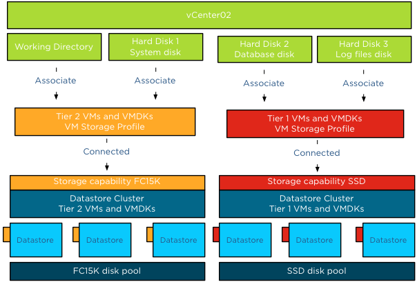Please note that all datastores must be configured with the same storage capability. If one datastore is not associated with a storage capability or has a different storage capability than its sibling datastores, the datastore cluster will not surface a storage capability. One virtual machine – different levels of service required Generally faster disk have higher cost per gigabyte and have a lower maximum capacity per drive, this usually drives various design decisions and operational procedures. Typically Tier 1 applications and data caching mechanisms end up in on the fastest storage disk pools. Most virtual machines are configured with multiple hard disks. A system disk containing the Operating System and one or more disks containing log files and data. The footprint of the virtual machine is made up out of a working directory and its VMDK files. When reviewing the requirements of the virtual machine, it is common that only the VMDKs containing the log files and the databases require low latency disks while the system disk can be placed in a lower tier storage pool. And this is the reason why you can assign multiple different VM storage profiles to a virtual machine. Multiple VM storage Profiles Let’s use an example; in this scenario we are going to deploy the virtual machine vCenter02. The virtual machine is configured with three disks, Hard disk 1 contains the OS, Hard disk 2 contains the database and Hard disk 3 contains the log files. We associated the VM with two VM Storage Profiles. To avoid wasting precious low latency disk space in the Tier 1 datastore cluster, we are going to associate the VMs working directory (containing the VM swap file) and the 60GB system disk are to the Tier 2VM storage profile, which is connected to Tier 2 Storage capability.