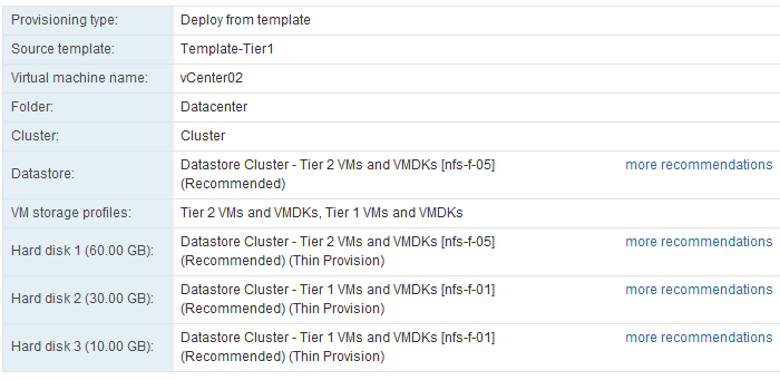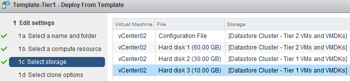 These steps have to be repeated for every hard disk of the virtual machine. At this point the working directory (configuration file) and the System disk will be placed on Datastore Cluster Tier 2 and the Database disk and Log file disk will be placed on Datastore Cluster Tier 1 once the deployment process has completed.