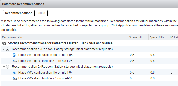 Storage DRS generates placement recommendations and these can be changed if you want to select a different datastore. By selecting the option “more recommendations” a window is displayed and will show you alternative destination datastores.