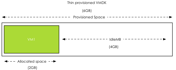 The behavior of thin provisioned disk VMDKs in a datastore cluster is quite interesting. Storage DRS supports the use of thin provisioned disks and is aware of both the configured size and the actual data usage of the virtual disk. When determining placement of a virtual machine, Storage DRS verifies the disk usage of the files stored on the datastore. To avoid getting caught out by instant data growth of the existing thin disk VMDKs, Storage DRS adds a buffer space to each thin disk. This buffer zone is determined by the advanced setting “PercentIdleMBinSpaceDemand". This setting controls how conservative Storage DRS is with determining the available space on the datastore for load balancing and initial placement operations of virtual machines. IdleMB The main element of the advanced option “PercentIdleMBinSpaceDemand” is the amount of IdleMB a thin-provisioned VMDK disk file contains. When a thin disk is configured, the user determines the maximum size of the disk. This configured size is referred to as “Provisioned Space”. When a thin disk is in use, it contains an x amount of data. The size of the actual data inside the thin disk is referred to as “allocated space”. The space between the allocated space and the provisioned space is called identified as the IdleMB. Let’s use this in an example. VM1 has a single VMDK on Datastore1. The total configured size of the VMDK is 6GB. VM1 written 2GB to the VMDK, this means the amount of IdleMB is 4GB.