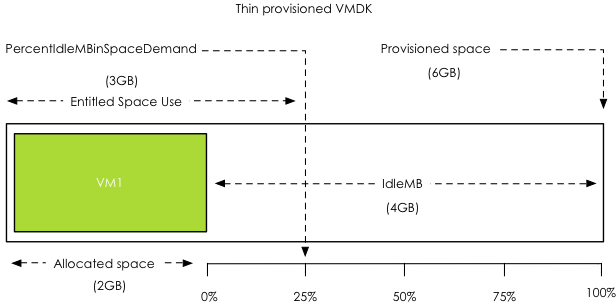 PercentIdleMBinSpaceDemand The PercentIdleMBinSpaceDemand setting defines percentage of IdleMB that is added to the allocated space of a VMDK during free space calculation of the datastore. The default value is set to 25%. When using the previous example, the PercentIdleMBinSpaceDemand is applied to the 4GB unallocated space, 25% of 4GB = 1 GB. Entitled Space Use Storage DRS will add the result of the PercentIdleMBinSpaceDemand calculation to the consumed space to determine the “entitled space use”. In this example the entitled space use is: 2GB + 1GB = 3GB of entitled space use.