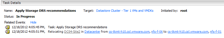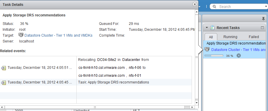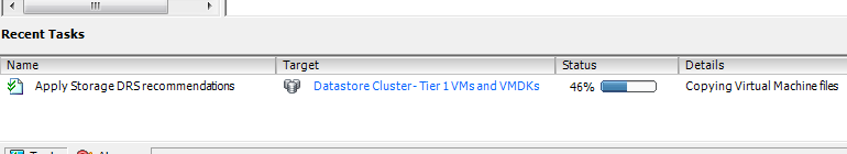 The new web client of vSphere 5.1 is my weapon of choice when working in my lab. It contains a lot of “hidden” gems, the UI team spends a lot of time crafting and aligning the user-interface to the administrator needs. One thing that drove me nuts was the lack of information when running a Storage vMotion operation. The Recent task doesn’t show anything, other than Storage vMotion operation itself and the target. When using Storage DRS, it only shows the name of the target Datastore cluster. Sometimes you just want to know which datastore the virtual machine migrated to. The new recent task window For example, take a look at the Recent Tasks window in the right size of the corner of the web client. When running a storage vMotion operation, it displays the Storage vMotion task similar to the vSphere client. However, when clicking on the task itself it shows the event info and task in one view. Helping you identify the source and destination datastore of the Storage vMotion process.