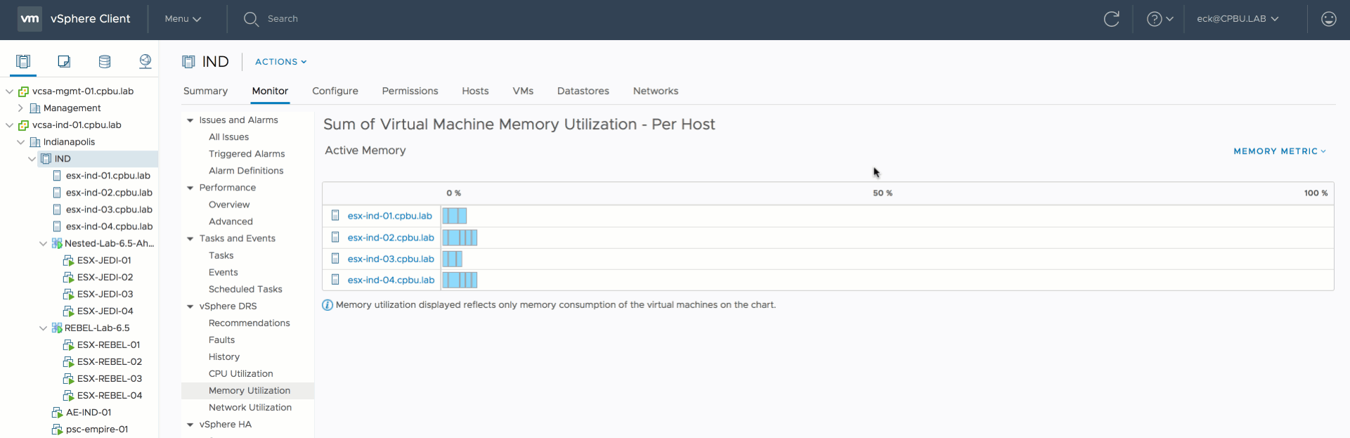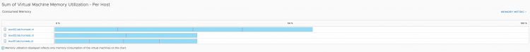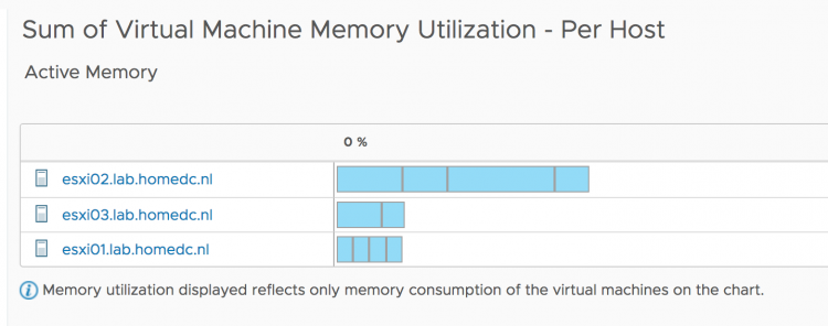 However since the active memory of each host is less than 20% and each virtual machine is receiving the memory they are entitled to, DRS will not move virtual machines around. Remember, DRS is designed to create as little overhead as possible. Moving one virtual machine to another host to make the active usage more balanced, is just a waste of compute cycles and network bandwidth. The virtual machines receive what they want to receive now, so why take the risk of moving VMs? But a different view of the current situation is when you toggle the graph to use consumed memory.
