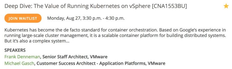 Some applications are able to provide certain services like replication themselves, thus it makes no sense to “replicate” that service at the infrastructure layer. vSAN and its storage policies allow the admin to provide storage services that are tailor-made to the application stack. Cormac Hogan and Christos Karamanolis talk about why vSAN is the ultimate choice for running next-gen apps. Visit their session “HCI1338BU-HCI: The Ideal Operational Environment for Cloud-Native Applications” to hear about real-world use-cases and learn what you need to do when dealing with these next-gen apps. Please note that if you attempt adding these sessions to your schedule, you might get a warning that you are on the waiting list. As we understood it, all sessions are booked in small rooms and depending on the waiting list they are moved to bigger rooms. Thus sign up for these sessions even if they state waiting list only. It will be sorted out during the upcoming weeks.