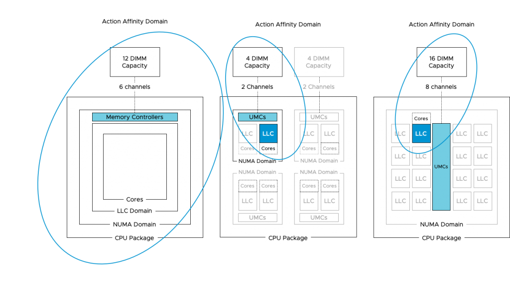 As the majority of the data centers are running on Intel, vSphere is optimized for a CPU topology where the NUMA and LLC domain are of consistent scope, i.e. the same size. With AMD the scopes are different and thus the current CPU scheduler can make “sub-optimal” decisions, impact performance. What happens is that the NUMA scheduler dictates the client size, the number of vCPUs to run on a NUMA Home Node, but it’s up to the CPU scheduler discretion to decide which vCPU to run on which physical core. As there are multiple Cache domains within a NUMA client, it can happen that there is an extraordinary amount of vCPU migrations between the cache domains within the NUMA domain. And that means cold cache access and a very crowded group of cores.