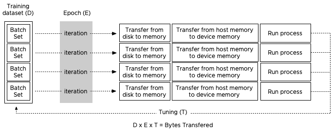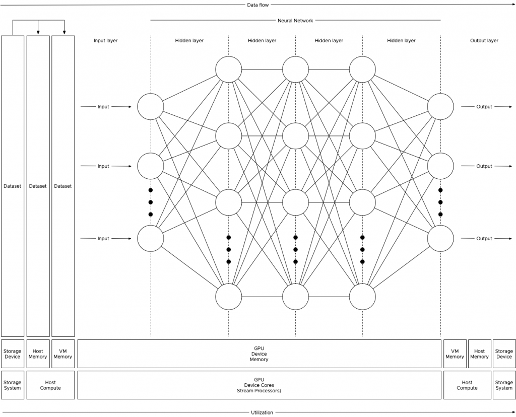 To understand the dataflow of an ML workload through the system, let’s get familiar with some neural network terminology. Most of the ML workload use the Compute Unified Device Architecture (CUDA) for GPU programming, and when using a batch of the training data, the CUDA program takes the following steps: