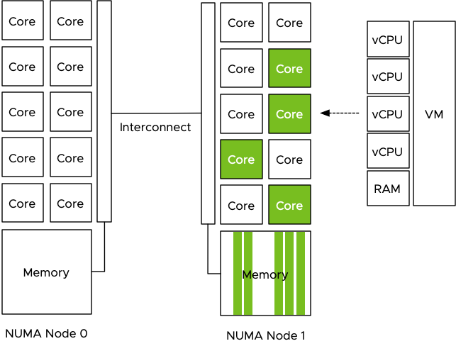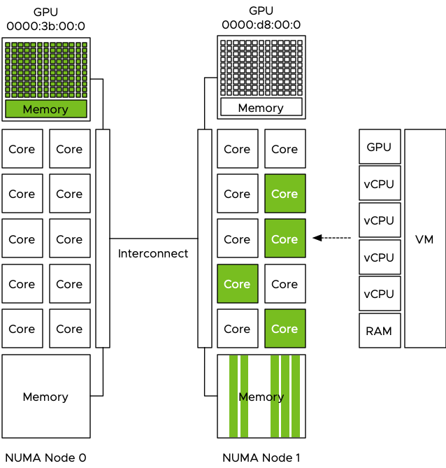 Let use the example of a 4 vCPU VM with 32 GB, running on a host with 512GB memory with 2 processors containing 10 cores each. The dataset used is 160GB of data and it cannot be stored in the VM memory and in the GPU device memory, thus the data scientist sets the batch size to 16GB. The program fetches 16GB of training data from the datastore and the NUMA scheduler ensures the data is stored within the local memory of the processor the four vCPU run on. In this case, the vCPUs of the VM are scheduled on the cores of CPU 1 (NUMA node 1) and thus the NUMA scheduler requests the VMkernel memory scheduler to store it in the memory pages belonging to the memory address space managed by the memory controllers of CPU 1.