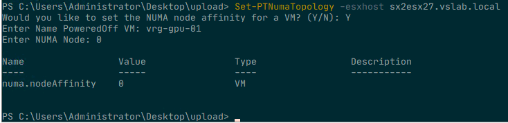 If you decide to set a NUMA affinity on a particular VM, the Get-PTNumaTopology function can help you to set it correctly. As a failsafe, the script proceeds to ask if you would like to set the NUMA node affinity of a powered off VM. Answer “N” to end the script and return to the command-line. If you answer “Y” for yes, it will then ask you to provide the name of the VM. Please note that this setting can only be applied on a powered-off VM. Setting an advanced setting means that the system is writing to this to the VMX file and the VMX file is in a locked state during the power-on state of a VM. The next step is to provide the NUMA Node you want the vCPUs to set the affinity for. Use the same number listed in the PCI NUMA Node column behind the attached passthrough device.