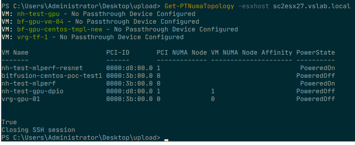 To make sense of it all, I created a simple PowerCLI module with two functions that show the VMs that have a passthrough device configured. The output shows the VM name and the PCI address of the device so that you can relate that to what you see in the UI. The next column shows the NUMA node to which the PCIe device is connected. The next column indicates whether the advanced setting numa.affinity is set for that particular VM and its value. The last column shows the power state of the VM. To set the NUMA affinity, the VM has to be powered off.