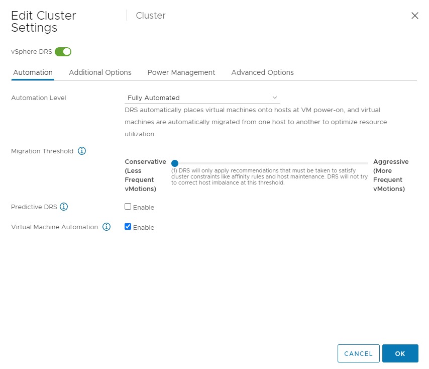 Using the setting “Conservative (1)”, DRS only triggers migrations for solving cluster constraints and violations. Meaning that if you put an ESXi host into maintenance mode, DRS moves the VMs out of that host. Or if due to a maintenance mode migration, or HA event, an anti-affinity rule is violated, DRS moves that particular VM to solve that problem. But that’s it. No moves to solve any VM happiness or host imbalance. If you want to reduce the number of vMotions and still like DRS to get the best resources for the virtual machines, do not set DRS to the utmost left setting but set it to setting 2.