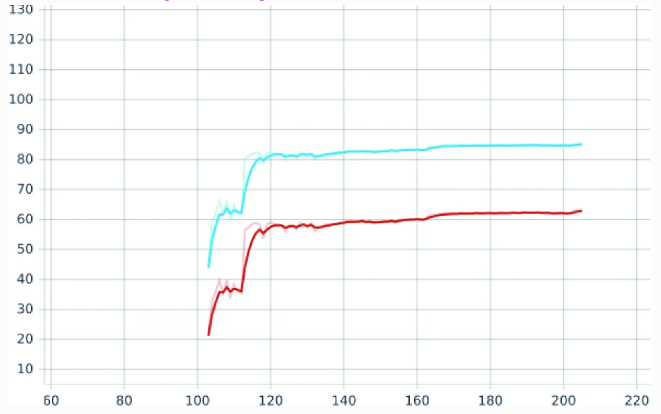 Retraining of the pre-trained Resnet50 with global sparsity of 20%. Retraining starts at epoch 104. Top5 is marked in blue, and Top1 in red.