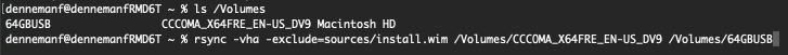 rsync -avh --progress --exclude=sources/install.wim /Volumes/CCCOMA_X64FRE_EN-US_DV9/ /Volumes/64GBUSB