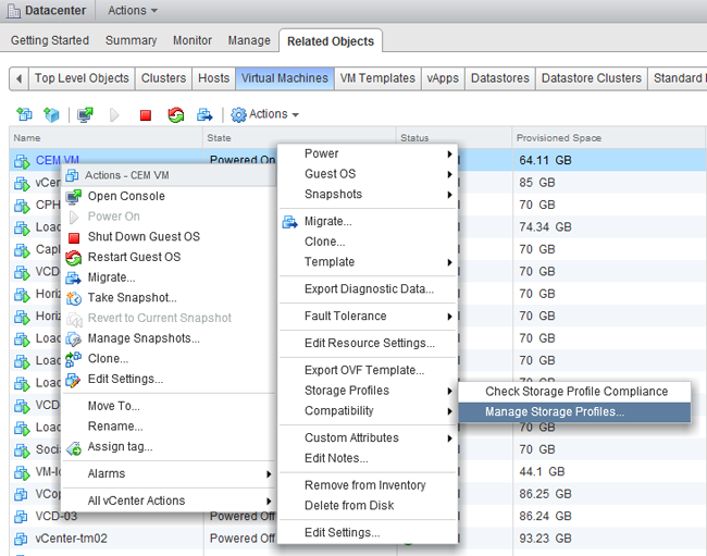10. Right click on a virtual machine 11. Select All vCenter Actions 12. Select Storage Profiles 13. Select Manage Storage Profiles