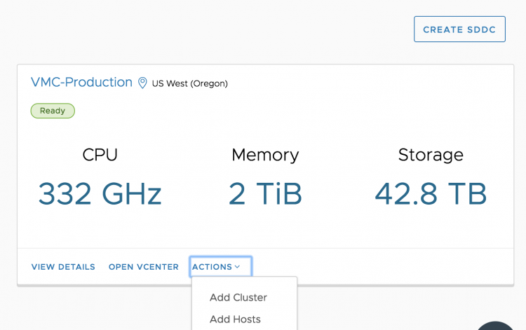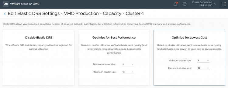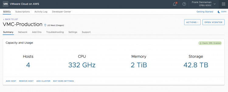 In essence, the performance policy is more eager to keep the resources than the cost-optimized policy. If you set the EDRS cluster to cost-optimized, an ESXi host is removed from the vSphere cluster if CPU and memory utilization is consistently below 60% and storage utilization is consistently below 20%. How to Configure Elastic DRS Log into your VMware Cloud on AWS console and select the cluster. A message box will show Elastic DRS is enabled on the cluster.