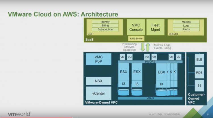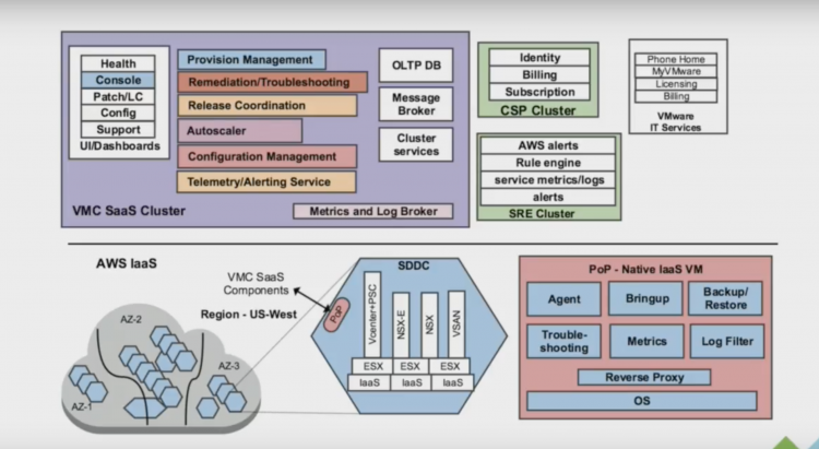 Elastic DRS allows the cluster to respond to workload utilization automatically. It allows for automatic scale-out and scale-in, without the need for human intervention. Stretched Clusters protects the workload in the Cloud SDDC from AZ outages. If something happens, HA detects the failed VMs and restarts them on different physical servers in the remaining AZ without manual human involvement. Content library, allows the customer to subscribe the in-cloud SDDC to a template repository that automatically provides VM templates to the in-cloud SDDC. Read Williams post for more info Disaster Recovery as a Service, just go to the console, enable the add-on and the in-cloud components for SRM and vSphere Replication are automatically deployed and configured. Connect it to your on-prem components and you can build your DR runbooks. And there are many more functions that cover the lights-on, maintenance, housekeeping and optimize tasks of day 2. Now with that explained, the stories continue and a debate broke out on twitter. Some said it needs a form of CMP (eg. vRealize) for operating the SDDC. https://twitter.com/KenNalbone/status/1020106642287886337 This is an interesting observation, for which operation? Not for life-cycle or infrastructure management. We will take care of that for you. VMC is a fully managed service by VMware. It is responsible for the uptime and the lifecycle of the SDDC. we have built a CMP platform on the AWS infrastructure that allows us to deal with VMC. In a presentation of Chris Wegner (one of the principal engineers of VMC) the architecture is explained.