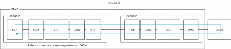 To be more precise, the IO traverses an additional component before hitting the IFOP. This component is called the Coherent AMD socKet Extender (CAKE). It facilitates die-to-die or socket-to-socket memory transactions. This module translates the request and response formats used by the SDF transport layer to and from the serialized format used by the IFOP. What that means is that a few extra hops and CPU cycles are introduced when fetching data stored within DIMMs attached to other Zeppelins on the same die. AMD reports a latency of ~145ns.