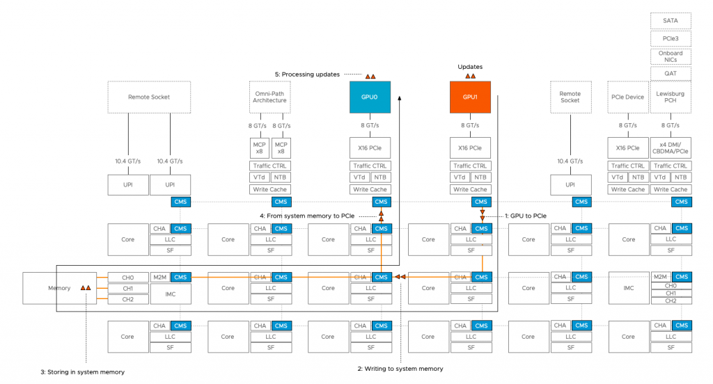 This synchronization is interesting when designing your ML platform as specific data to help run the model has to traverse the interconnect either between devices within the ESXi system or between VMs (or containers) running on the platform. More about this in a later paragraph.