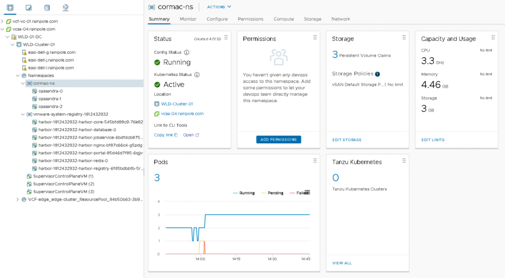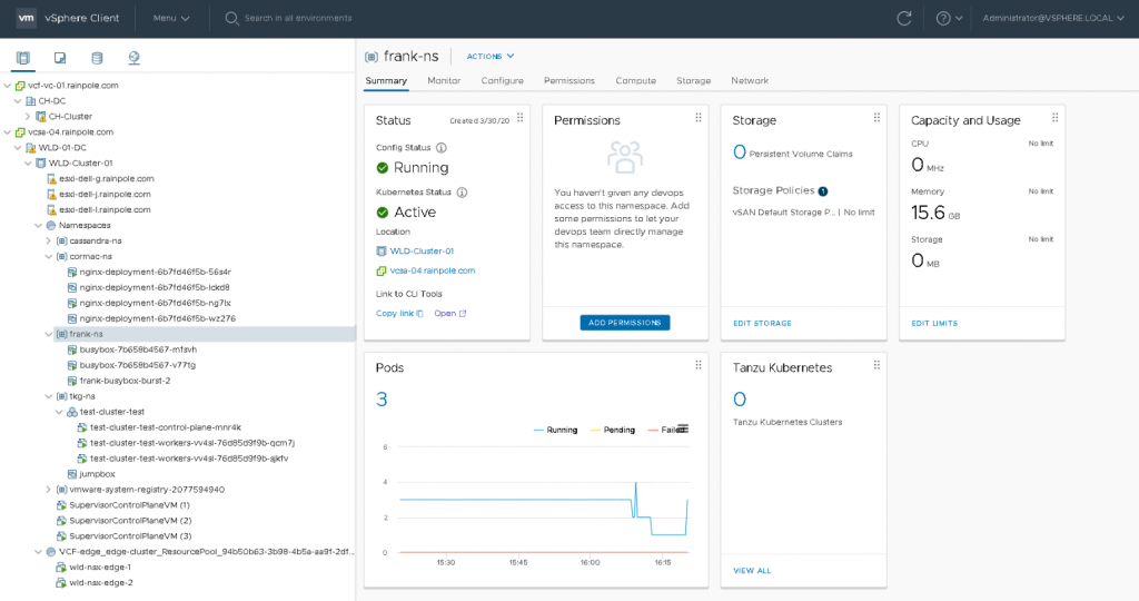 As you can see, this new construct is treated to a new icon. The summary page on the right side of the screen shows the status, the permission (not configured yet), the configured storage policy attached, and the capacity and usage of compute resources. The bottom part of the screen shows whether you have deployed pods or TKG clusters. In this example, three pods are currently running.