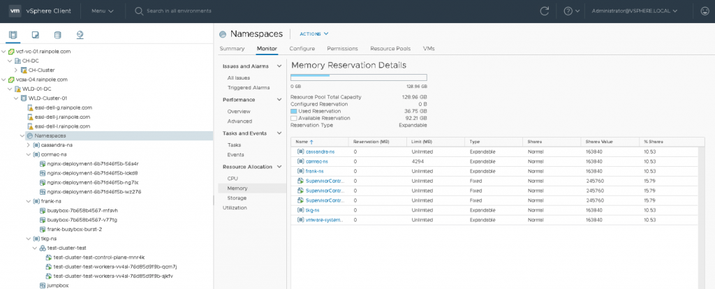 A Supervisor namespace does not provide the option to set a reservation at the namespace level. However, the resource pool is configured with an expandable reservation and that allows the resource pool to request for unreserved resources from its parent. These unreserved resources are necessary to satisfy the request for reservable resources for a workload. The resource pool “Namespaces” is the parent resource pool where all namespaces are deployed in. The resource pool “Namespaces” is not configured with reserved resources and as a result, it will request unreserved resources from its parent, which is the root resource pool, better known as the cluster object.