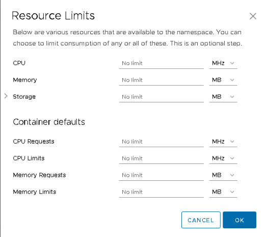 A vAdmin can set a limit on CPU or memory resources for the entire namespace. This way, the developer can deploy the workload in the namespace, and not risk consuming the full compute capacity of the supervisor cluster. Beyond the resource pool limits, a vAdmin can also set a per container default limit. The namespace will automatically apply a limit to each incoming workload, regardless of the resource configuration specified in the YAML file of the containerized workload. On top of this, the vAdmin can also specify object limits. A maximum number of pods can be specified for the namespace, ultimately limiting the total consumed resources by the workload constructs deployed in the namespace.