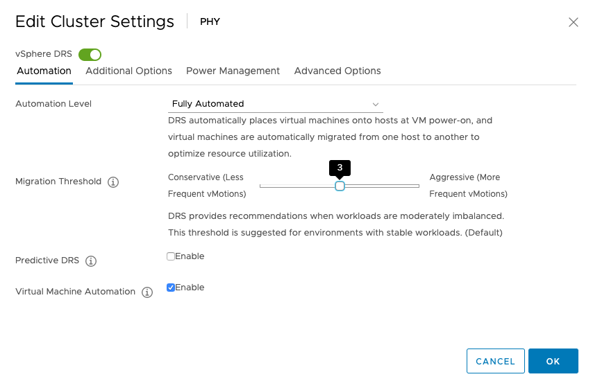 Other than greatly improving the text describing each migration threshold, the appearance and behavior of the Migration Threshold (MT) have not changed much in vSphere 7. By default, the slider is set to the moderate “3” setting. There are two more aggressive load-balance settings, 4, and 5. 5 Being the most aggressive. To the left of the default, there are two settings, 1 and 2. However, only setting 2 generates load-balancing recommendations. If you set the slider to 1, the most conservative option, DRS only produces migration recommendations that are considered mandatory. Mandatory moves are generated for a few events, the three common reasons are when the host is placed into maintenance mode, when a proactive HA evacuation occurs, or when a VM violates an (anti-) affinity rule. The remainder of the article describes the setting of the sliders by referring to the numbers.