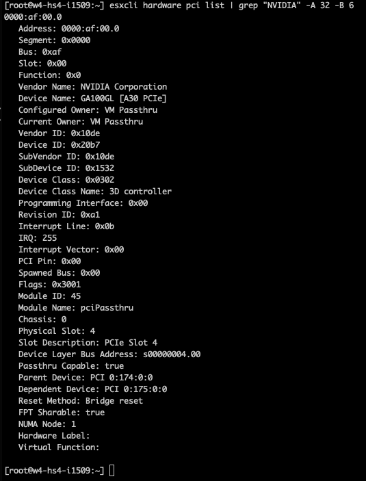 In the case of the A30, we need to understand its PCIe-NUMA locality. The easiest way to do this is to log on to the ESXi server through an SSH session and search for the device via the esxcli hardware pci list command. As I’m searching for an NVIDIA device, I can restrict the output of this command by using the following command “esxcli hardware pci list | grep “NVIDIA -A 32 -B 6”. This instructs the grep command to output 32 lines (A)after and 6 lines (B)before the NVIDIA line. The output shows us that the A30 card is managed by the PCI controller located in NUMA node 1 (Third line from the bottom).