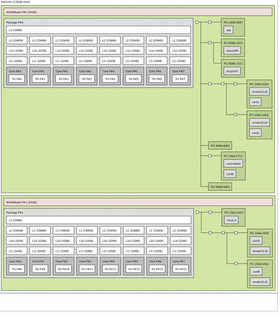 Now the GPU is a part of NUMA node 1. How we can confirm that is true is by taking the PCI device at address 04:00:00 given in the small green box that is inside Package 1 and seeing that is the same address as that given in the “esxcli hardware pci list” for the GPU - that is seen at the line titled “Device Layer Bus Address” in that esxcli output. Because the virtual GPU device is now a part of NUMA node 1 the guest OS memory optimization can allocate memory within NUMA node 1 to store the dataset there so that it is as close to the device as possible. The NUMA scheduler and the CPU and memory scheduler within the ESXi layer attempt to follow these instructions to the best of their ability. If you want to be absolutely sure, you can assign NUMA affinity and CPU affinity at the lowest layers, but we recommend starting at this layer and testing this first before impacting the lowest scheduling algorithms.