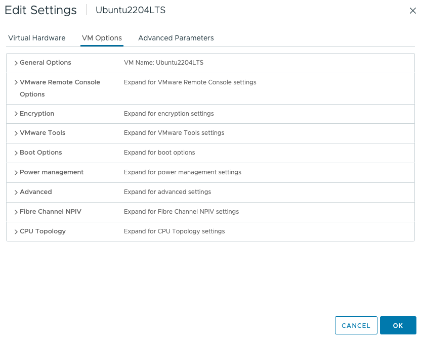There seems to be some misunderstanding about the new vSphere 8 CPU Topology Device Assignment feature, and I hope this article will help you understand (when to use) this feature. This feature defines the mapping of the virtual PCIe device to the vNUMA topology. The main purpose is to optimize guest OS and application optimization. This setting does not impact NUMA affinity and scheduling of vCPU and memory locality at the physical resource layer. This is based on the VM placement policy (best effort). Let’s explore the settings and their effect on the virtual machine. Let’s go over the basics first. The feature is located in the VM Options menu of the virtual machine.