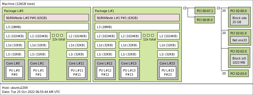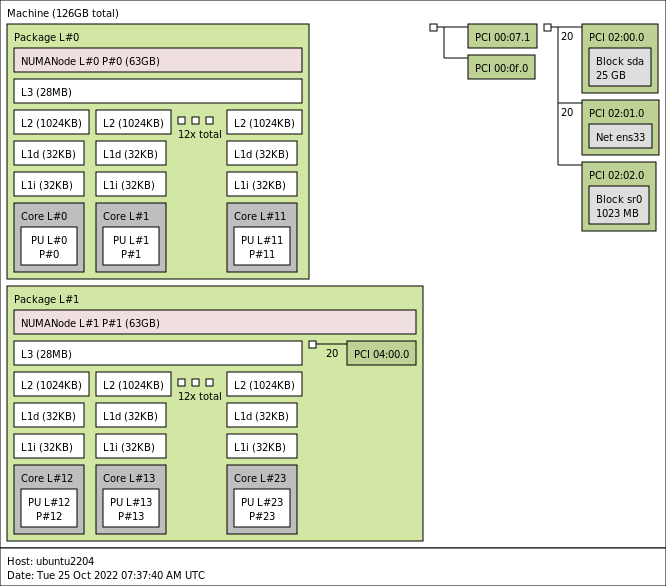 This allows us to configure the PCIe devices. As you might have noticed, I’ve added a PCIe device. This device is an NVIDIA A30 GPU in Dynamic Direct Path I/O (Passthrough) mode. But before we dive into the details of this device, let’s look at the virtual machine’s configuration from within the guest OS. I’ve installed Ubuntu 22.04 LTS and used the command lstopo. (install using: sudo apt install hwloc)