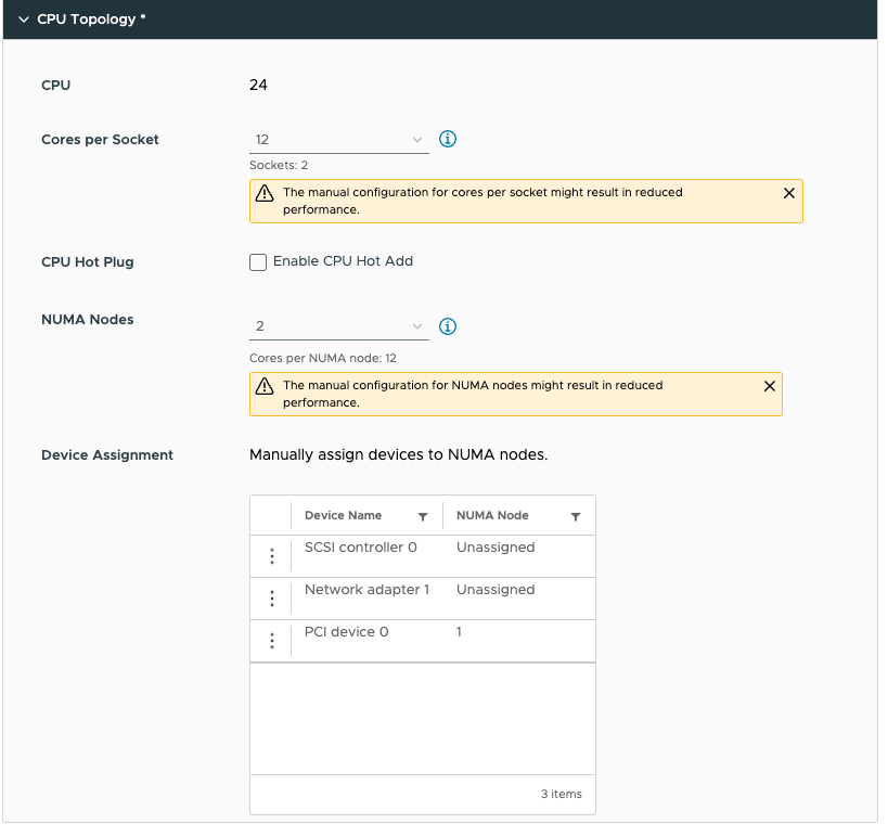 By default, the Cores per Socket and NUMA Nodes settings are “assigned at power on” and this prevents you from assigning any PCI device to any NUMA node. To be able to assign PCI devices to NUMA nodes, you need to change the Cores per Socket setting. Immediately, a warning indicates that you need to know what you are doing, as incorrectly configuring the Cores per Socket can lead to performance degradation. Typically we recommend aligning the cores per socket to the physical layout of the server. In my case, my ESXi host system is a dual-socket server, and each CPU package contains 20 cores. By default, the NUMA scheduler maps vCPU to cores for NUMA client sizing; thus, this VM configuration cannot fit inside a single physical NUMA node. The NUMA scheduler will distribute the vCPUs across two NUMA clients equally; thus, 12 vCPUs will be placed per NUMA node (socket). As a result, the Cores per Socket configuration should be 12 Cores per Socket, which will inform ESXi to create two virtual sockets for that particular VM. For completeness’ sake, I specified two NUMA nodes as well. This setting is a PER-VM setting, it is not NUMA Nodes per Socket. You can easily leave this to the default setting, as ESXi will create a vNUMA topology based on the Cores per Socket settings. Unless you want to create some funky topology that your application absolutely requires. My recommendation, keep this one set to default as much as possible unless your application developer begs you otherwise.