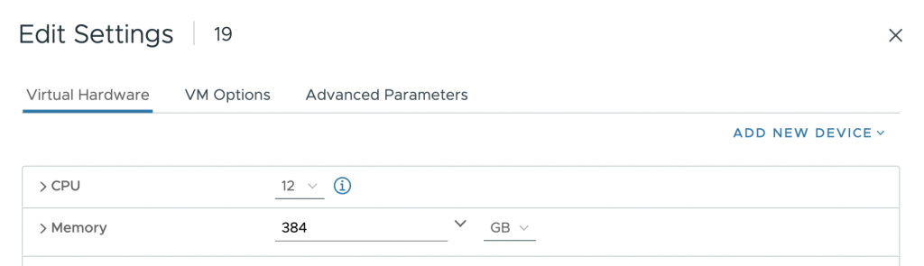 As a test, I’ve created a VM with 12 vCPUs and 384GB. The vCPU configuration fits a single NUMA node (12<20), but the memory configuration of 384GB exceeds the 256GB of each NUMA node.