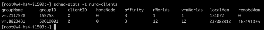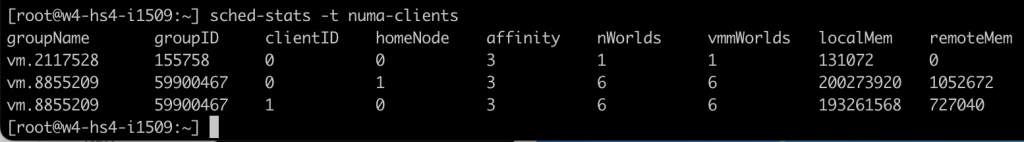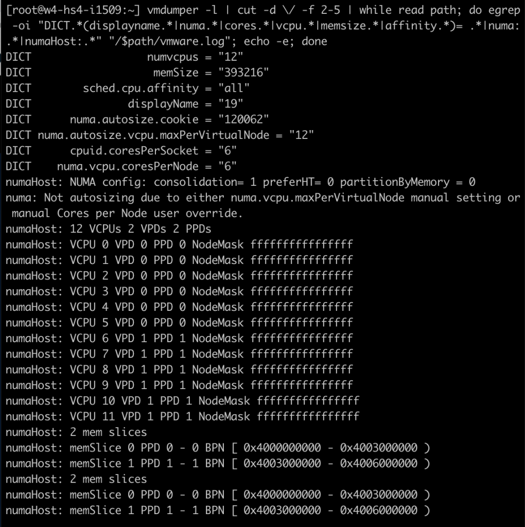 After the virtual machine is powered-on, I opened up a SSH session to the ESXi host and ran the following command: “vmdumper -l | cut -d \/ -f 2-5 | while read path; do egrep -oi “DICT.(displayname.|numa.|cores.|vcpu.|memsize.|affinity.)= .|numa:.|numaHost:.” “/$path/vmware.log”; echo -e; done”
