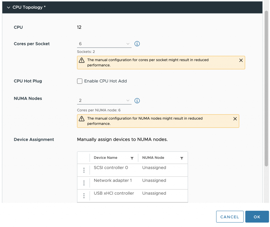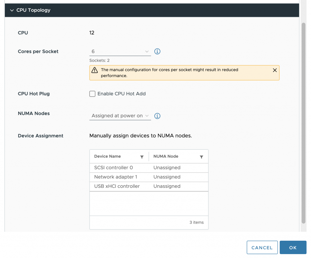 By default, the Cores per Socket and NUMA Nodes settings are “assigned at power on,” which is the recommended setting for most workloads. In our case, we want to change it, and first, we have to change the Cores per Socket settings before we can adjust the NUMA Nodes setting. It’s best to distribute the vCPUs equally across the physical NUMA nodes so that each group of vCPU can allocate an equal amount of memory capacity. The VM configuration is set to 6 cores per socket in our test case, creating two vSockets.