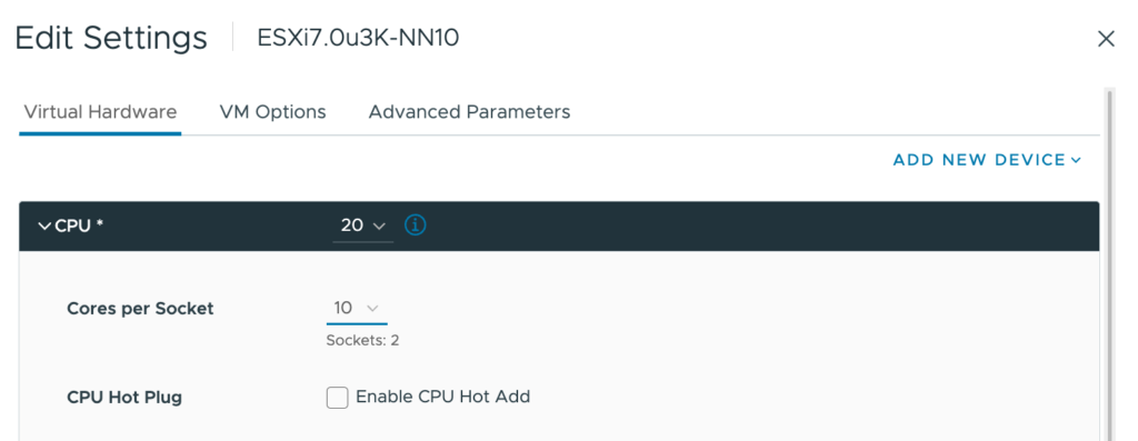 My physical ESXi hosts are equipped with Intel Xeon Gold 5218R CPUs, containing 20 cores per socket. The smallest ESXi host contains ten cores per socket in the environment I need to simulate. Therefore, I created a virtual ESXi host with 20 vCPUs and ensured that there were two virtual sockets (10 cores per socket)