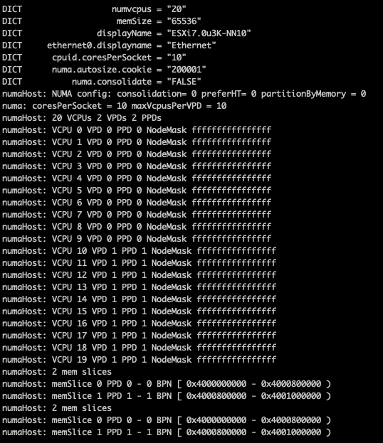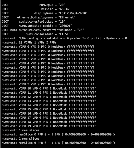I prefer removing the numa.autosize.vcpu.maxPerVirtualNode setting, as this automatically follows the PPD configuration, it avoids mismatches between numa.vcpu.maxPerVirtualNode and the automatic numa.consolidate = "false" configuration. Plus, it’s one less advanced setting in the VMX, but that’s just splitting hairs. After powering up the nested ESXi virtual appliance, you can verify the NUMA configuration once more in the physical ESXi host: