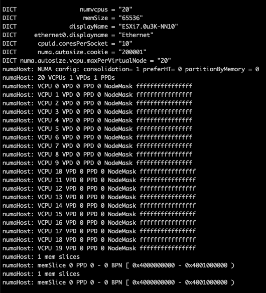 It only detects 1 NUMA node as the virtual NUMA client configuration has been decoupled from the Cores Per Socket configuration since ESXi 6.5. As a result, the VM is presented by the physical ESXi host as a single virtual NUMA node, and the virtual ESXi host picks this up. Logging in to the physical host, we can validate the nested ESXi VM configuration and run the following command.