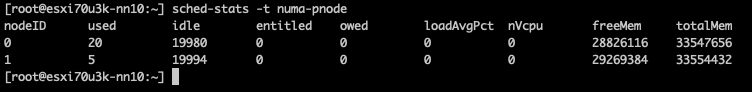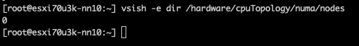 However, it doesn’t indicate the number of NUMA nodes supported by the ESXi kernel. You would expect that two CPU packages would correspond to at least two NUMA nodes. The commandvsish -e dir /hardware/cpuTopology/numa/nodes shows the number of NUMA nodes that the ESXi kernel detects