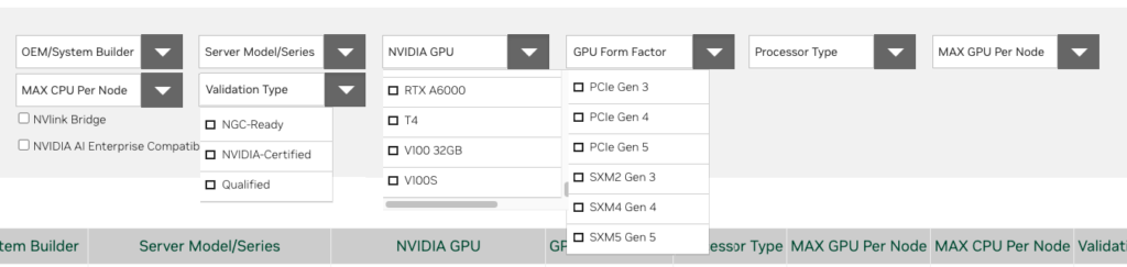 The NVIDIA Qualified Server Catalog provides an easy overview of all the server models and their specific configuration and NVIDIA validation types. It offers the ability to export the table in a PDF and Excel format at the bottom of the page. Still, I like the available filter system to drill down to the exact specification that suits your workload needs. The GPU device differentiators article can help you select the GPUs that fit your workloads and deploy location.