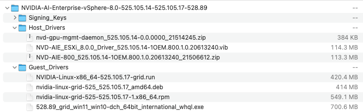 We are interested in the “NVIDIA AI Enterprise 3.1 Software Package for VMware vSphere 8.0” package. This package contains both the NVD-AIE Host VIB and the compatible guest os driver.